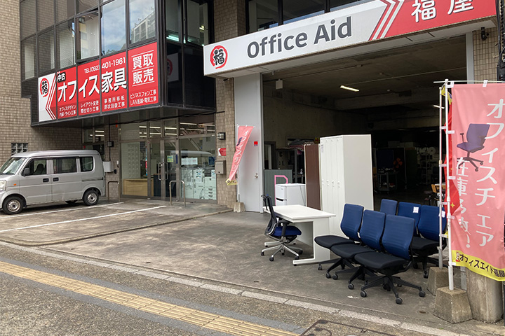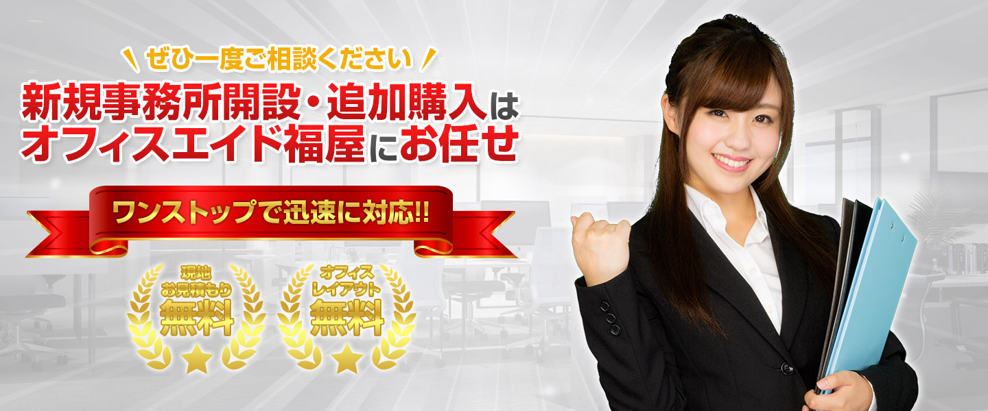 オフィスエイド福屋では倉庫型店舗を構え店頭販売やネット販売を行っております。 品質・価格ともに自信を持ってご案内させて頂いておりますので、 気になる点やご相談など御座いましたら、どうぞお気軽にお問い合わせくださいませ。