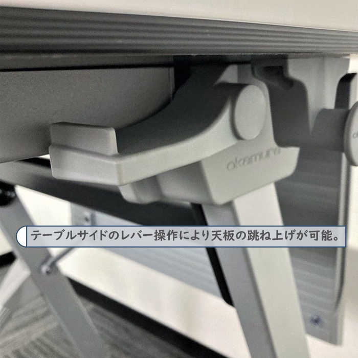 使用されない場合は簡単なレバー操作で天板を跳ね上げて重ねて収納可能です。