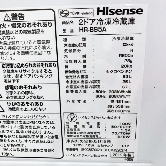 ハイセンス 2ドア冷凍冷蔵庫 HR-B95A ホワイト 2019年製 中古