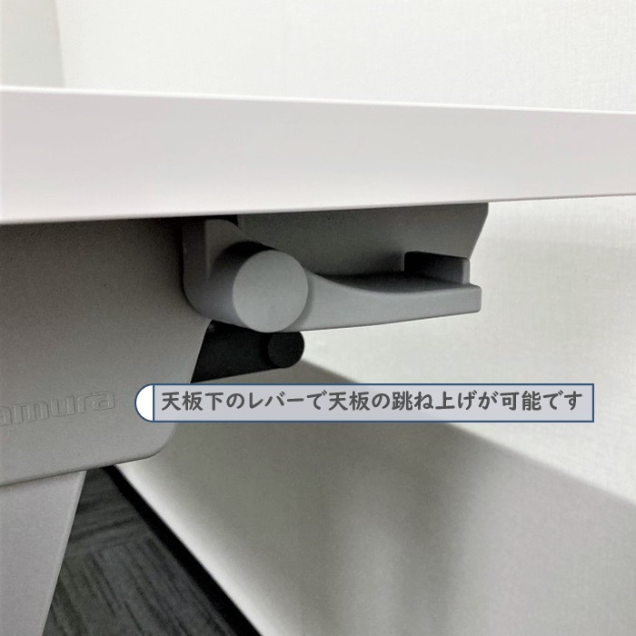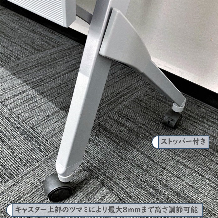 キャスター付きで移動も手軽に行なえ、使用されない場合は天板を跳ね上げることで平行に重ねて収納できます。
