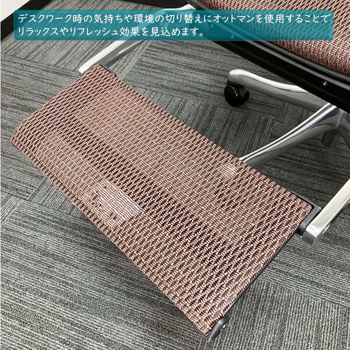 業務に集中される場合は前傾チルト姿勢で使用し、リラックスしたい時はオットマンを使って、ON/OFFの切り替えをスムーズに行え、より効率的にデスクワークを行えます。