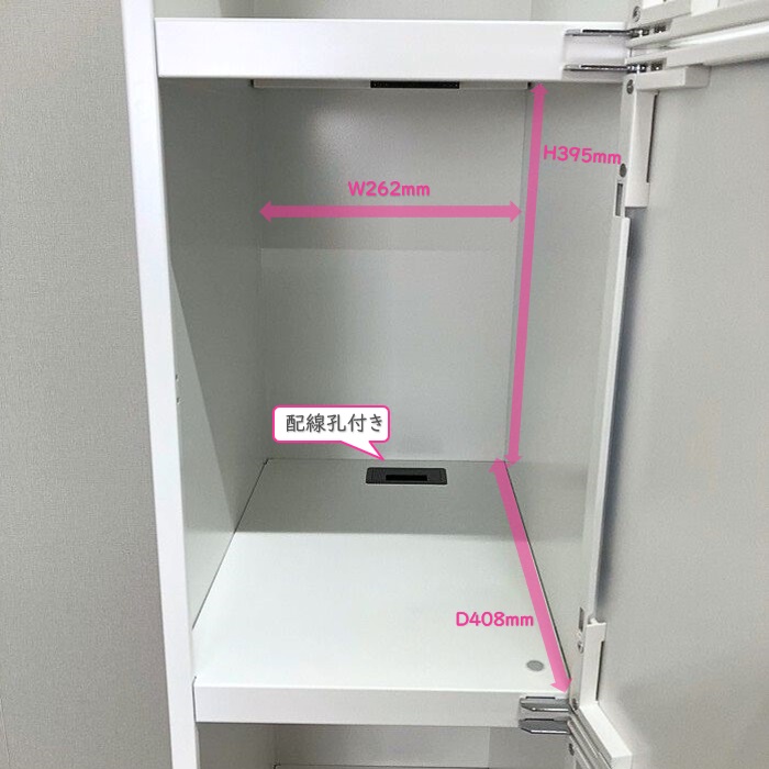 庫内の底部に配線孔がありますので、コンセントを取り付けることでモバイル類の充電も可能です。