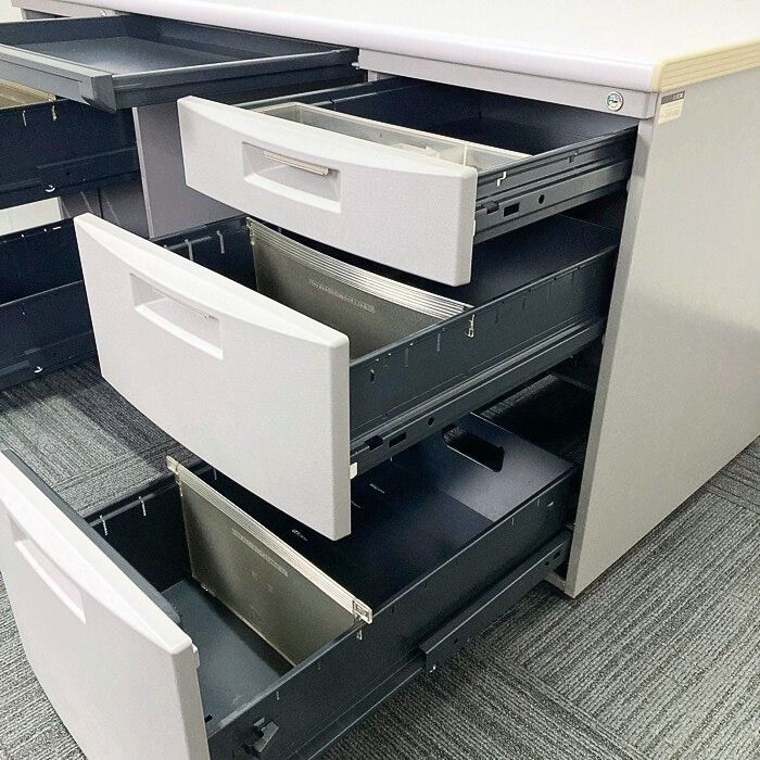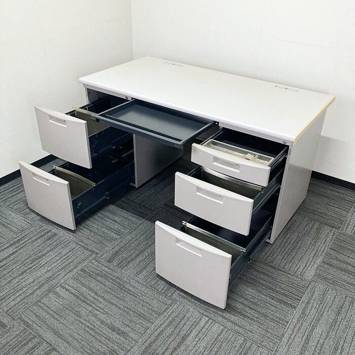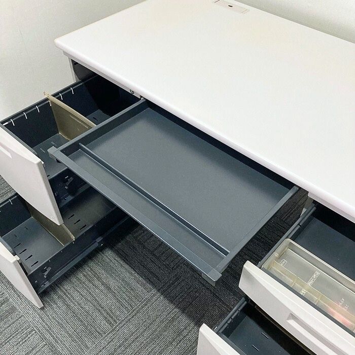 収納箇所はセンター引出し、左2段袖、右3段袖とたっぷり御座います。