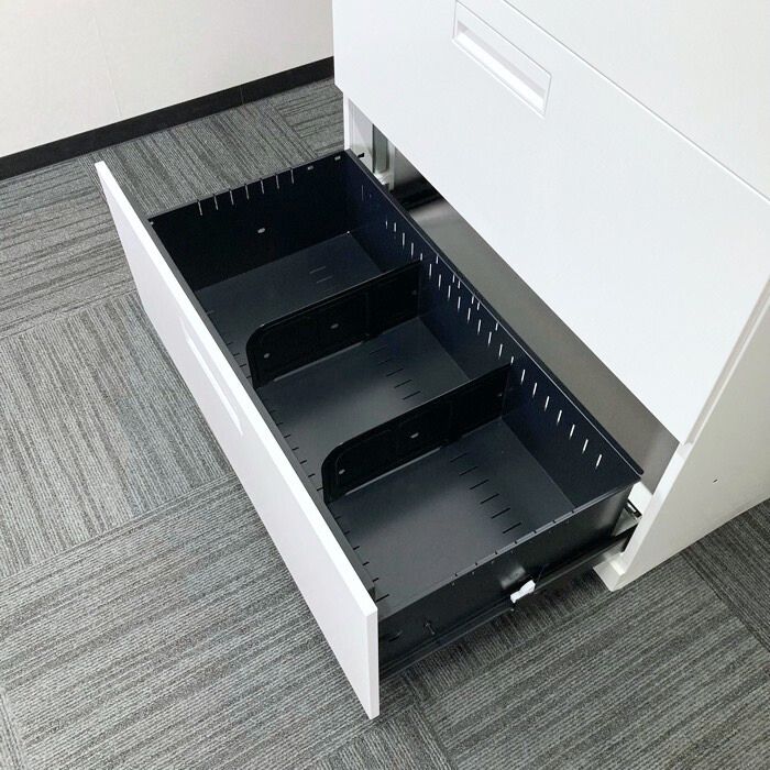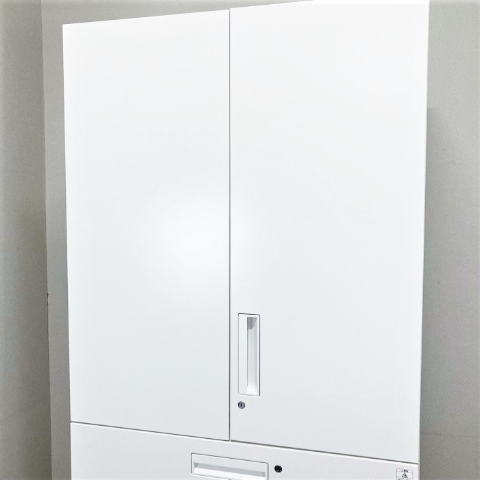 上置きは観音開き扉で中身を一目で見渡せ、下置きは引き出し仕様でしゃがまずにファイルの出し入れが可能です。