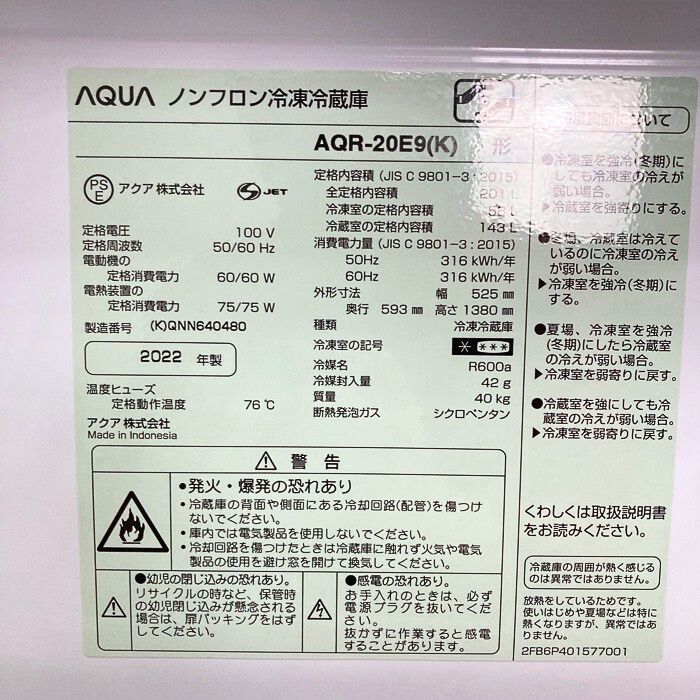 アクア 冷凍冷蔵庫 AQR-20E9(K)寸法:W525×D593×H1380 容積:201L ウッドブラック 2022年製 中古 ⑩