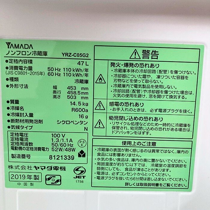 YAMADA 冷蔵庫 YRZ-CO5G2寸法:W472×D450×H492 容積:45L ホワイト 2019年製 中古 ⑩