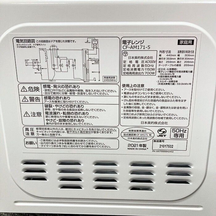 コンフィー 単機能電子レンジ CF-AM171-5 容積:17L ターンテーブル ホワイト 2021年製 中古 ※東日本専用
