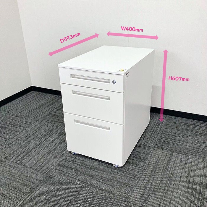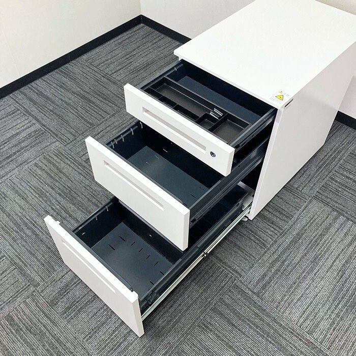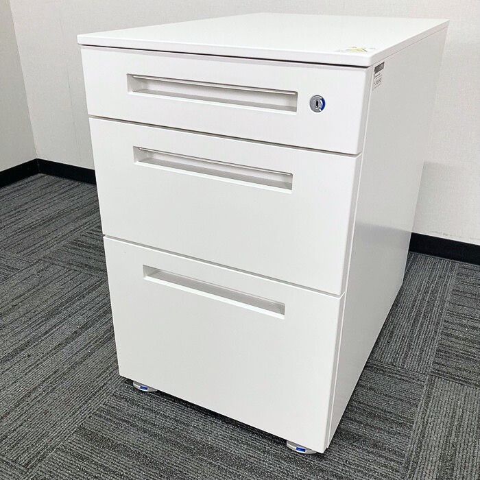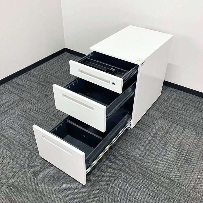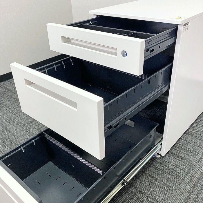 引出し全段ラッチ付、インジケーター付リバーシブル錠(オールロック)、下段A4収納可、キャスター(ストッパー)付