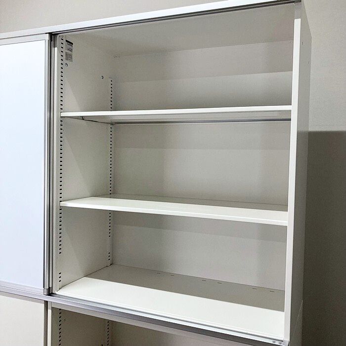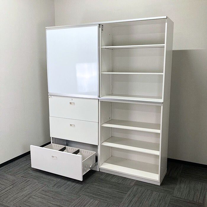 書庫にホワイトボードを取り付けすることでスペースの有効活用になり、上置きの書庫はスライド扉書庫としてご使用頂けお勧めの商品です。