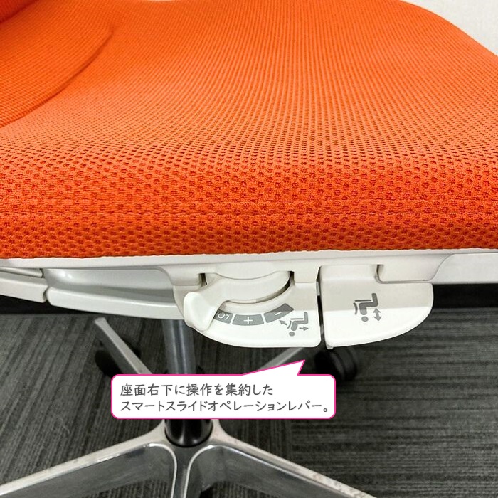 機能操作はすべて座面右下に集約されており、操作性も実にスマートなオフィスチェアです。
