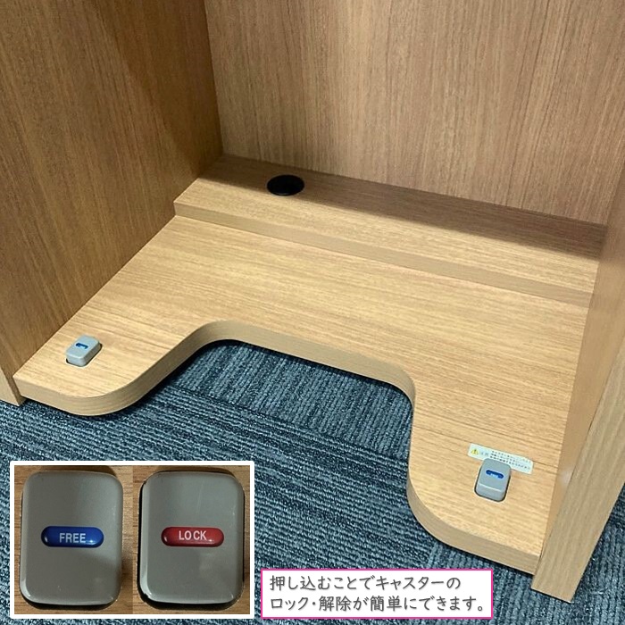 キャスター付きで移動も手軽に行なえ、配線孔もありモバイル対応可能です。