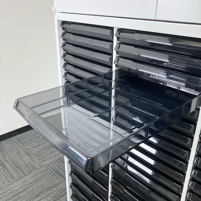 両開きはファイルなどの収納に、クリスタルトレイは書類や伝票の収納に優れております。