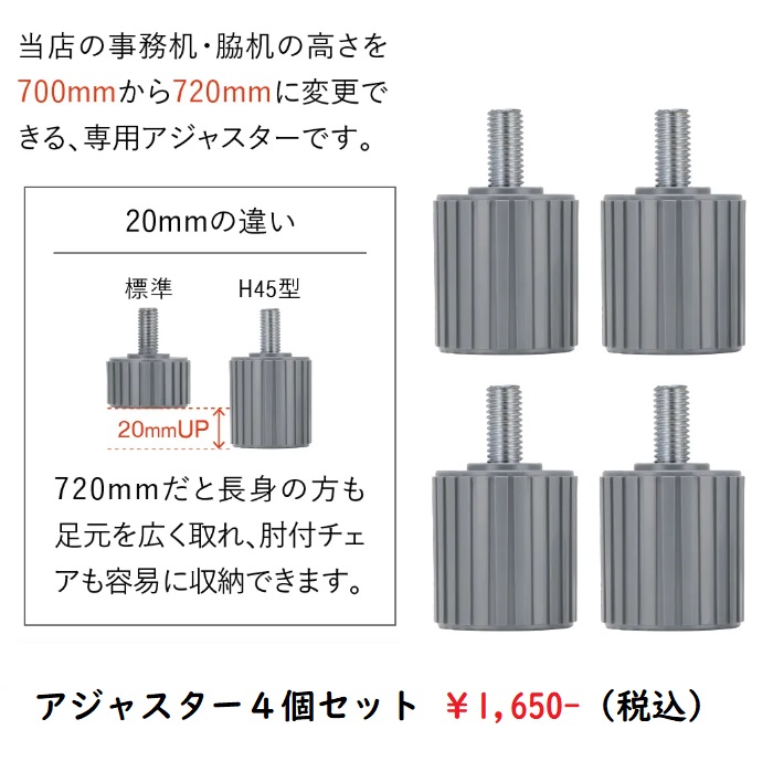 別売りのアジャスターに付け替えることでデスクの高さを720mmに変更可能です。※片袖デスクの場合はアジャスターが6個必要になります。