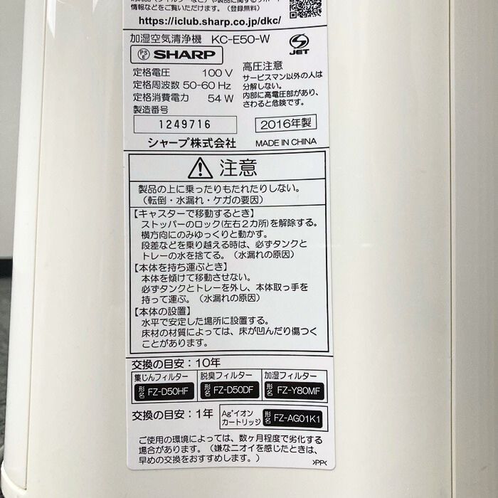 SHARP プラズマクラスター空気清浄機 KC-E50-W ホワイト 中古 ⑳