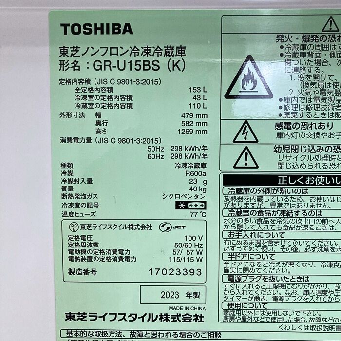 東芝 BSシリーズ 冷蔵冷凍庫 GR-U15BS(K) W479×D582×H1269 定格内容積:153L セミマットブラック 2023年製 中古
