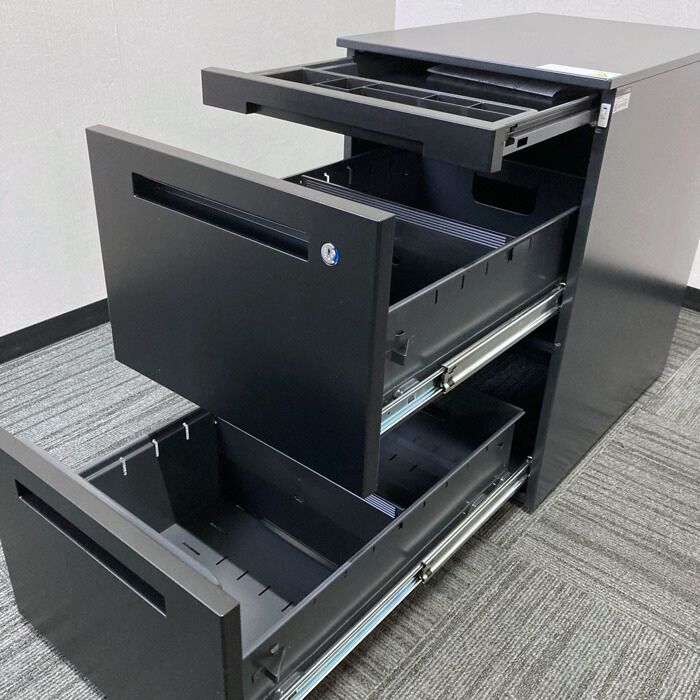 ブラック系の中古スチール家具は必ずと言ってよいほど擦れ、小キズ、塗装剥げが見受けられますが、こちらは新古品ため綺麗なコンディションで気持ちよくご使用頂けます。