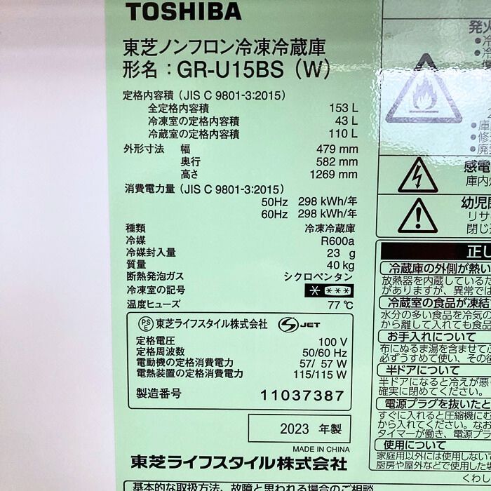 東芝 BSシリーズ 冷蔵冷凍庫 GR-U15BS(K) W479×D582×H1269 定格内容積:153L セミマットホワイト 2023年製 中古