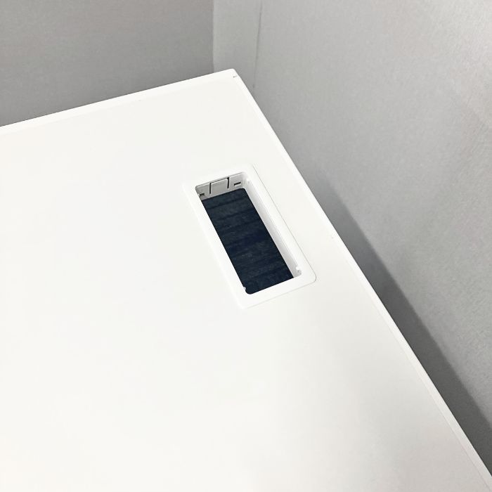 収納はセンター引出しが2個所、天板左後方に配線孔あり。