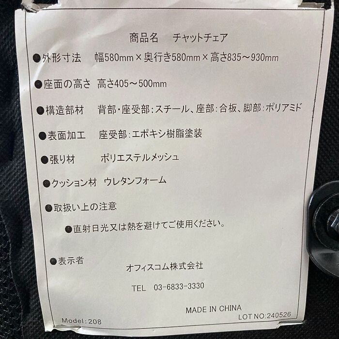 ・背 :ポリエステルメッシュ、スチールパイプ(粉体塗装)