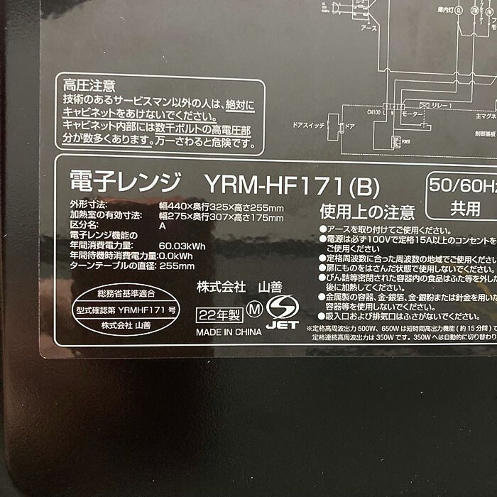 山善 電子レンジ RM-HF171(B) 17L 単機能 ヘルツフリー ターンテーブル オートメニュー搭載 全国対応 タイマー機能付き ブラック 2022年製 中古