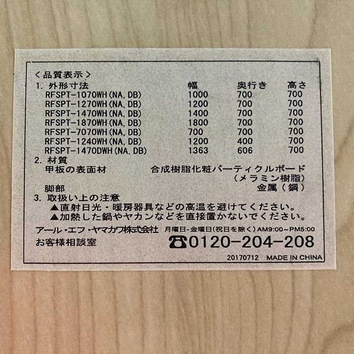 R.F.ヤマカワ シンプルテーブルラディシリーズ ワークテーブル RFSPT-1270W W1200×D700×H700 天板:ナチュラル/脚:ホワイト 2020年製 中古 ⑳