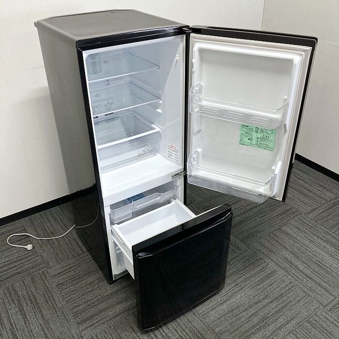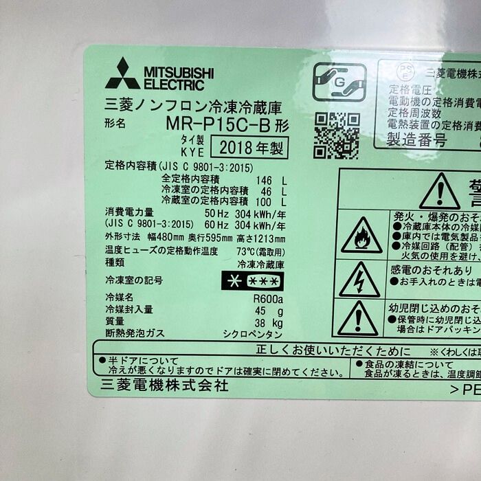 三菱電機 2ドア冷蔵庫 MR-P15C-B型 定格内容積 (L):合計146 質量 (kg):38 ブラック 2018年製 中古 ⑳