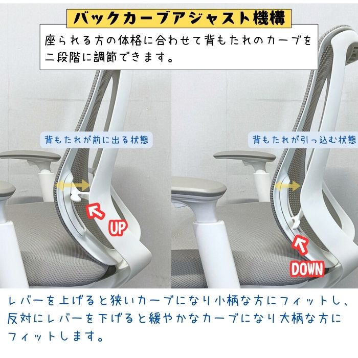 背もたれのカーブを2段階で調節できる新感覚のオフィスシーティング。