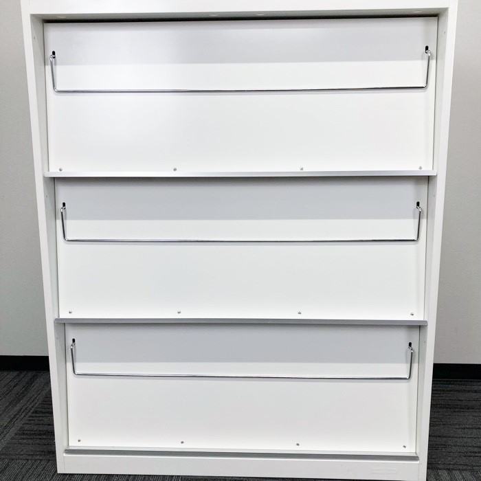 前面にパンフレットなどを展示でき、棚を上げると奥に収納スペースがあります。